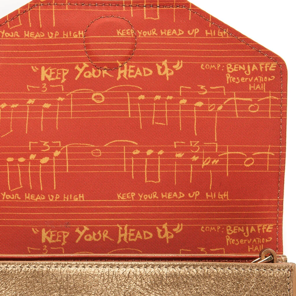 Preservation Hall Creative Director Ben Jaffe’s hand-written, original score for the Preservation Hall Jazz Band’s “Keep Your Head Up” – a song that would quickly become our pandemic-era anthem of hope – graces the lining of these gorgeous bags. The mantra is also emblazoned on a woven detachable strap for instruments or the bags in the collection.