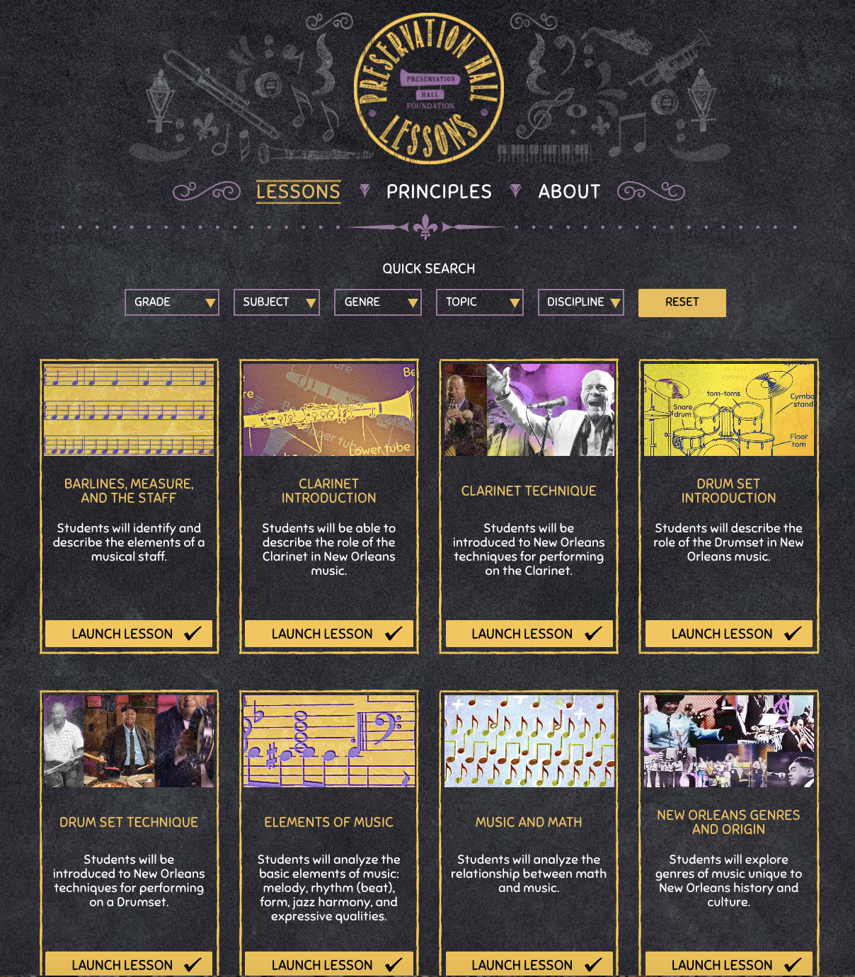 Preservation Hall Lessons is designed for K-12 students and includes content focused on introductory and advanced techniques for the range of instruments in a traditional jazz band, stylistic tips, as well as the cultural and historical context of New Orleans music. There are currently 22 lesson plans featuring exclusive videos and support materials, with more to come in the months and years ahead.